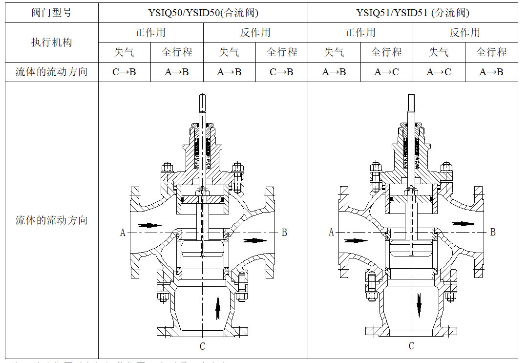 購買咨詢細(xì)節(jié)說明YSIQ(D)50系列氣/電動智能三通調(diào)節(jié)閥是國家2010年火炬計劃項目,擁有多項國家專利。該閥采用了通用性及互換性強的模塊化設(shè)計,結(jié)構(gòu)緊湊。帶有平衡活塞的套筒導(dǎo)向閥芯,采用不同材質(zhì)的活塞密封環(huán),實現(xiàn)壓力平衡特性,適用于各種高壓差的場合,滿足用戶的使用要求。閥座與閥體壓緊式的連接方式,有效提高了閥門的密封等級和穩(wěn)定性,并且使用維護極為方便,從而極大提高了調(diào)節(jié)閥的綜合性能。 YSIQ50系列氣動智能三通調(diào)節(jié)閥配用ZM10型多彈簧高強度執(zhí)行機構(gòu)和智能型閥門定位器;YSID50系列電動智能三通調(diào)節(jié)閥配用智能型電動執(zhí)行機構(gòu)。 ZM10型多彈簧高強度執(zhí)行機構(gòu)采用模塊化設(shè)計,可在現(xiàn)場方便更換正、反作用形式,并能對彈簧進(jìn)行有效的防腐蝕保護,從而延長了執(zhí)行機構(gòu)的使用壽命,方便了用戶的使用。執(zhí)行機構(gòu)與智能電氣閥門定位器的配套采用了無管路連接的設(shè)計,提高了調(diào)節(jié)閥的抗震性能、使用穩(wěn)定性與調(diào)節(jié)精度,滿足對工況的精確調(diào)節(jié)。 本系列產(chǎn)品有標(biāo)準(zhǔn)型、散熱型、波紋管密封型等多種型式。產(chǎn)品公稱壓力等級有PN(MPa)1.6、2.5、4.0、6.4、10.0(150lb、300lb、600lb);閥體口徑范圍DN(mm)25~250(1”~10”);適用流體溫度-40~+450℃范圍內(nèi)多種檔次;泄漏量等級:Ⅳ級;流量特性有直線、等百分比。多種品種規(guī)格可供選擇。 工作原理氣動YSIQ50:定位器接收標(biāo)準(zhǔn)電流信號或計算機信號,轉(zhuǎn)換為閥位設(shè)定值,執(zhí)行機構(gòu)的直線位移通過連接裝置轉(zhuǎn)換為角度位移,并由位置傳感器測得,反饋至微處理器。微處理器將實際閥位反饋值和設(shè)定值進(jìn)行比較,檢測到偏差后,根據(jù)偏差大小和方向輸出脈寬調(diào)制指令(PWM)到壓電閥,壓電閥按控制指令調(diào)節(jié)膜頭進(jìn)氣量或排氣量。??電動YSID50:標(biāo)準(zhǔn)電流信號或計算機信號經(jīng)A/D轉(zhuǎn)換后,進(jìn)入智能型電動執(zhí)行機構(gòu)的智能信號采集控制單元。信號采集控制單元隨時檢測輸入信號和位置反饋信號,當(dāng)兩個信號不平衡時,根據(jù)偏差大小和方向輸出脈寬調(diào)制指令(PWM)到雙向可控硅,使其導(dǎo)通并帶動電機向減小偏差的方向運轉(zhuǎn),進(jìn)而帶動減速機構(gòu)并改變閥門的開度。?控制模式控制模式采用PWM(Puise Width Modulation)驅(qū)動;全速狀態(tài):當(dāng)控制偏差很大時,輸出連續(xù)信號;中速狀態(tài):當(dāng)偏差不大時,輸出脈沖信號;慢速微調(diào):當(dāng)偏差很小時,輸出更小的脈沖信號;保持定位:當(dāng)偏差小到閥門調(diào)節(jié)精度范圍內(nèi),沒有控制指令輸出。 結(jié)構(gòu)圖 主要零件常用材料序號零件名稱常用材料1閥??體WCBWC6CF8CF8M2閥??座304、316+堆焊司太萊合金316+堆焊司太萊合金3閥??芯硬密封304、316+堆焊司太萊合金316+堆焊司太萊合金軟密封304、316+PTFE316+PTFE4閥 ?籠304、3163165導(dǎo)向套304、3163166閥??桿304、3163167閥??蓋WCBWC6CF8CF8M8平衡活塞HT200、Al9平衡活塞環(huán)氟橡膠、不銹鋼+增強聚四度乙烯、柔性石墨環(huán)*以上為常用材料,具體牌號以訂貨合同為準(zhǔn)。 規(guī)格與技術(shù)參數(shù)形 ???式三通壓力平衡型公稱通徑DN25~DN250(1”~10”)公稱壓力PN16、25、40、64、100(150lb、300lb、600lb)固有流量特性等百分比、直線固有可調(diào)比50﹕1上閥蓋形式標(biāo)準(zhǔn)型:鑄鋼:-20~200???鑄不銹鋼:-40~200散熱型:鑄鋼:-29~425???鑄不銹鋼:-40~450閥座泄漏量Ⅳ級、V級(請與技術(shù)部確認(rèn))、VI級(快開切斷型、軟密封) 流量特性閥座直徑dn(mm)253240506580100125150200250流量系數(shù)Kv8.51321345385135210340535800 流體的流動方向注:故障位置以主閥閥芯位置(水平通)來定義。 主要性能指標(biāo)序號項 ??目標(biāo)準(zhǔn)型智能閥散熱、低溫型智能閥1基本誤差<(%)±1±2.52回 ???差<(%)12.53死 ???區(qū)<(%)0.414始終點偏差<(%)±1±2.55額定行程偏差<(%)+2.5+2.5注:本產(chǎn)品性能指標(biāo)高于GB/T4213-2008。 閥體、閥內(nèi)件、填料材料的使用溫度·壓力范圍 執(zhí)行機構(gòu)技術(shù)參數(shù)ZM10系列氣動多彈簧執(zhí)行機構(gòu)由于采用了模塊化的設(shè)計,所以只需局部進(jìn)行簡單的拆、裝就可以實現(xiàn)氣開和氣關(guān)兩種作用方式的轉(zhuǎn)換。執(zhí)行機構(gòu)與閥門定位器之間的氣路連接采用了內(nèi)部連通的組合方式,并可將定位器排出的氣體注入彈簧室一側(cè),使彈簧室內(nèi)產(chǎn)生略高于外部環(huán)境大氣壓的壓力,以免外部環(huán)境中帶有腐蝕性的氣體被吸入,腐蝕彈簧等零部件。氣開式(FC):當(dāng)氣源故障時,執(zhí)行機構(gòu)彈簧將閥關(guān)閉。型號膜片面積?(cm2)彈簧數(shù)量行程?(mm)彈簧范圍?(KPa)推力?(KN)ZM10-121032075 ~ 1501.66150 ~ 3003.2ZM10-232033075 ~ 1502.46150 ~ 3004.8ZM10-372036075 ~ 15056150 ~ 300109180 ~ 3701312220 ~ 44016氣關(guān)式(FO):當(dāng)氣源故障時,執(zhí)行機構(gòu)彈簧將閥打開。型號膜片面積(cm2)彈簧數(shù)量行程(mm)彈簧范圍?(KPa)推力(KN) ?供氣壓力(MPa)0.20.30.40.50.6ZM10-121032075 ~ 1501.03.25.27.29.46150 ~ 300––2.14.26.3ZM10-232033075 ~ 1501.64.88.011.214.46150 ~ 300––3.26.49.6ZM10-372036075 ~ 1503.610.818.0